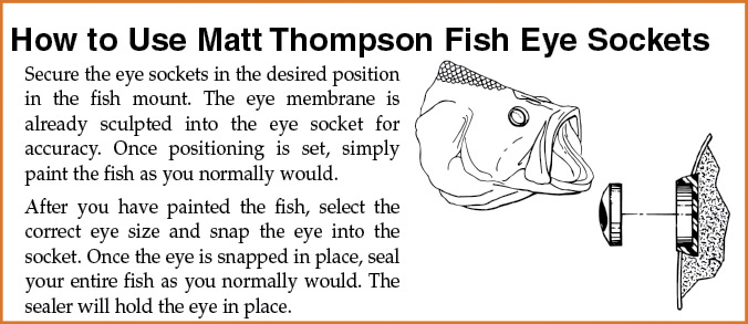 The Matt Thompson flexible eye socket system adds expression and life to fish mounts while saving time during the finishing process. Using this technique, you will never have to clean another eyes, because the eyes are installed after painting! Improved oval design works even better. Eye size to be used is the same as the socket size.